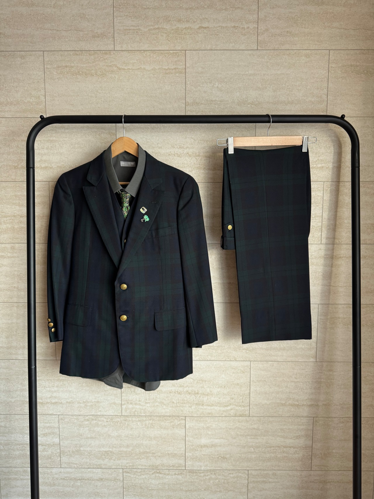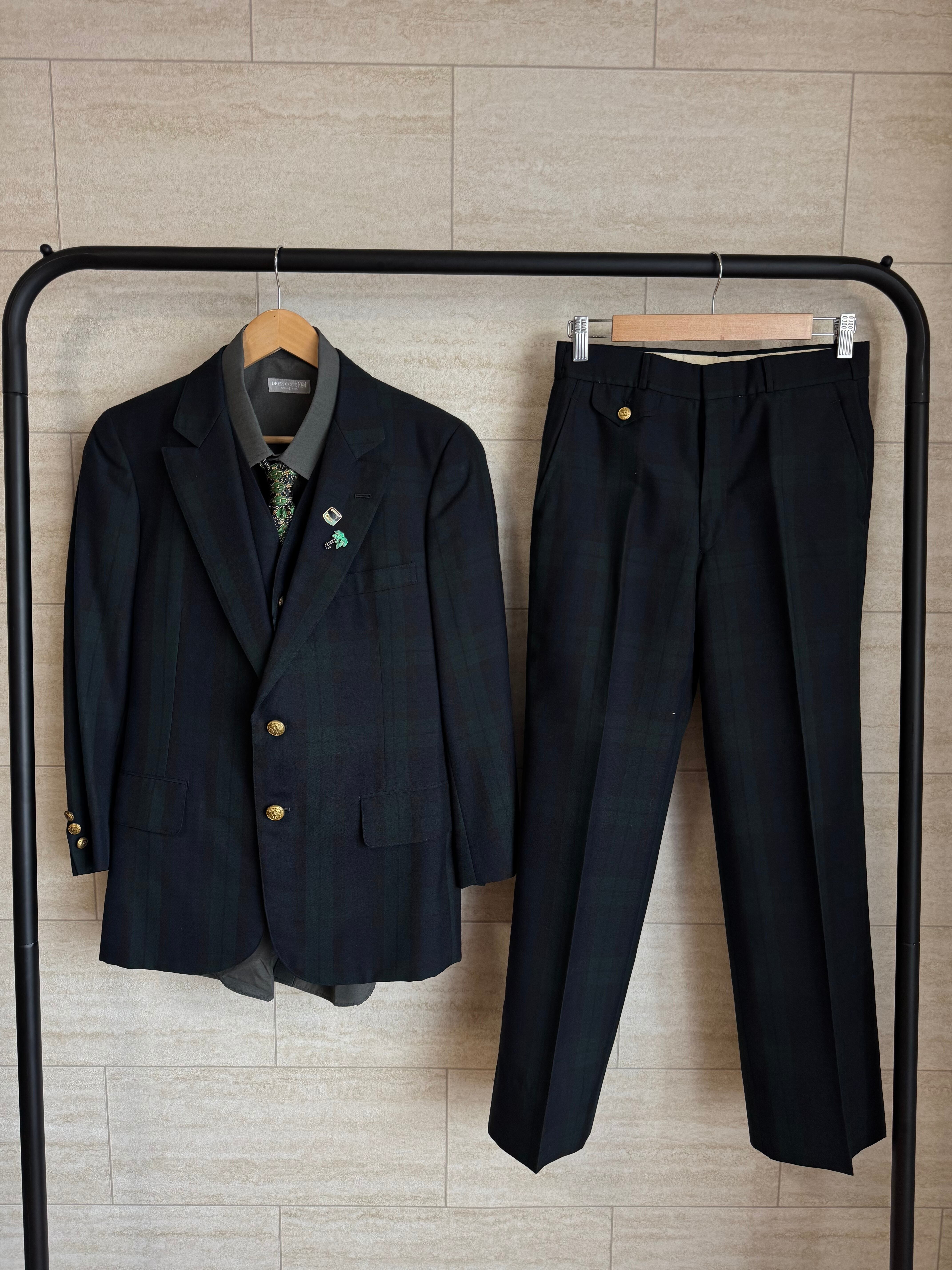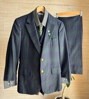 王道のブラックウォッチ柄に金ボタンが輝く、クラシカルな3ピーススーツ。