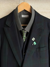 胸元に添えたコーヒーとヤシの木のピンズが、カッチリとした装いの中にリラックスした遊び心をプラス。伝統的なスタイルを自分らしく軽快に楽しむ、こなれ感抜群のセットアップです